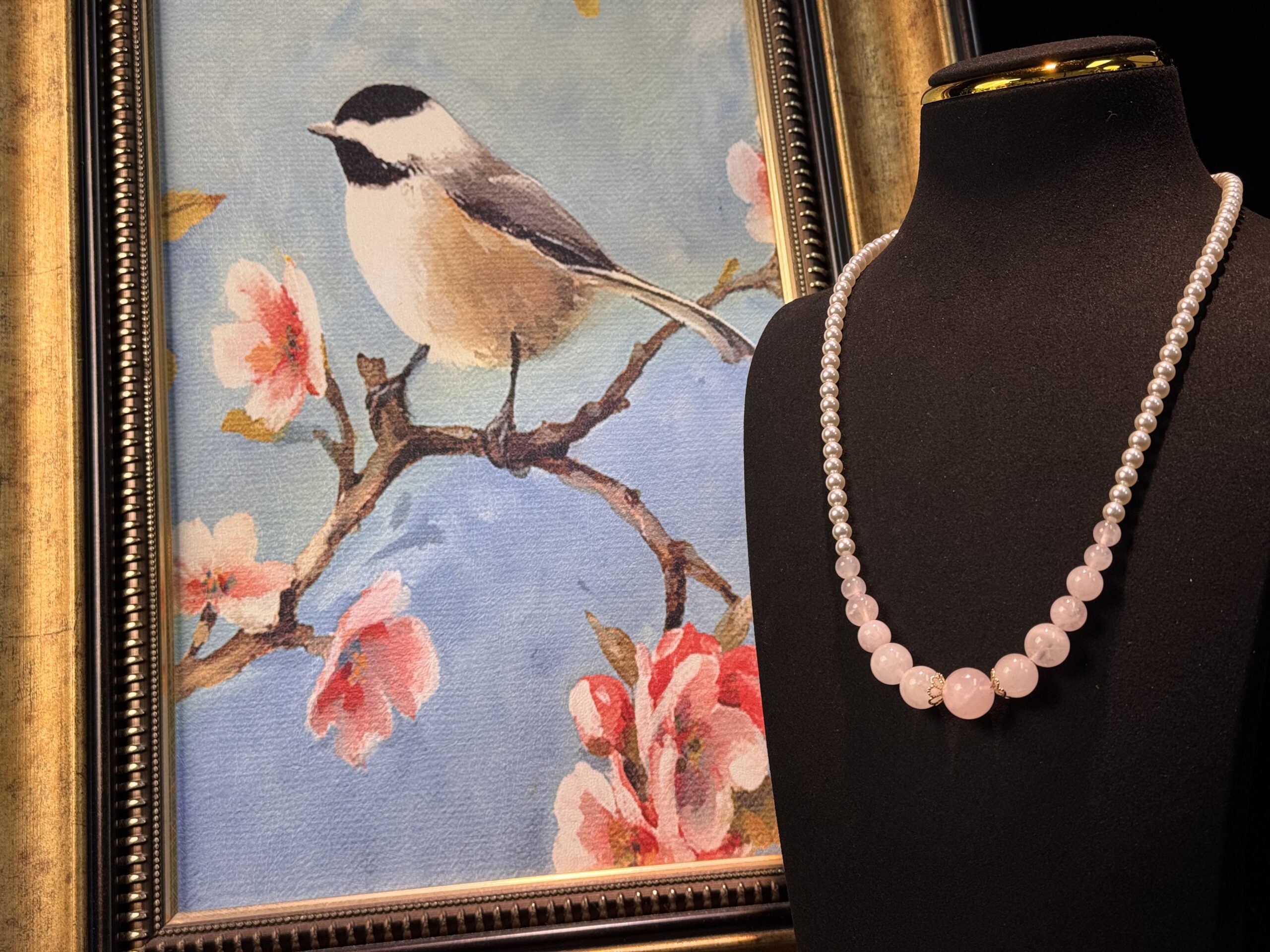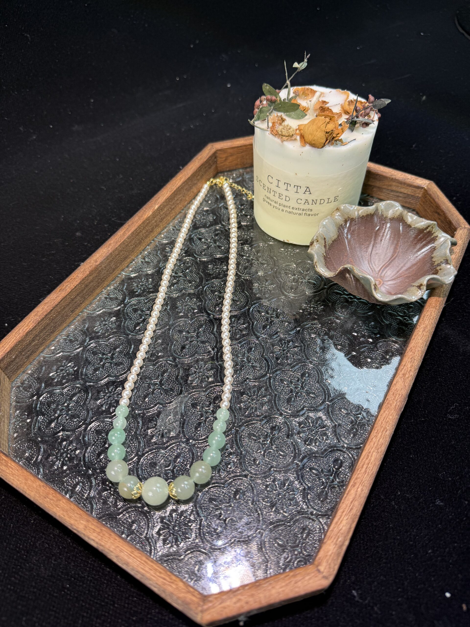 A luminous harmony of Austrian pearls, natural green crystal, and golden metal accents. Inspired by Aphrodite and Apollo, this piece balances emotional serenity with confident action—an elegant symbol of renewal, prosperity, and inner strength.